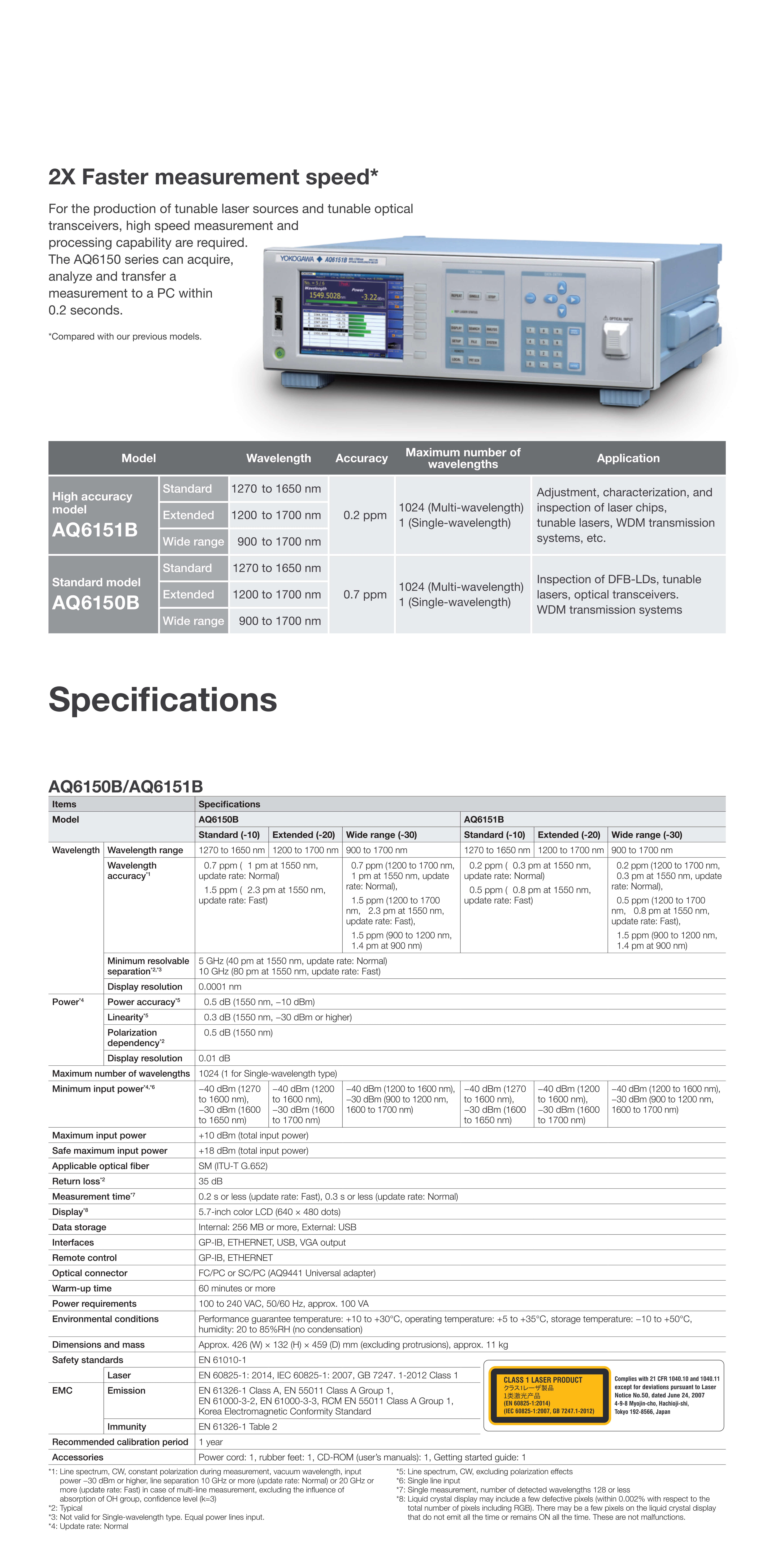 AQ6150系列一共有兩個機型。其中, AQ6151B是高精度型光波長計,波長精度高達±0.2ppm,可以滿足最高級別的精度測量要求。