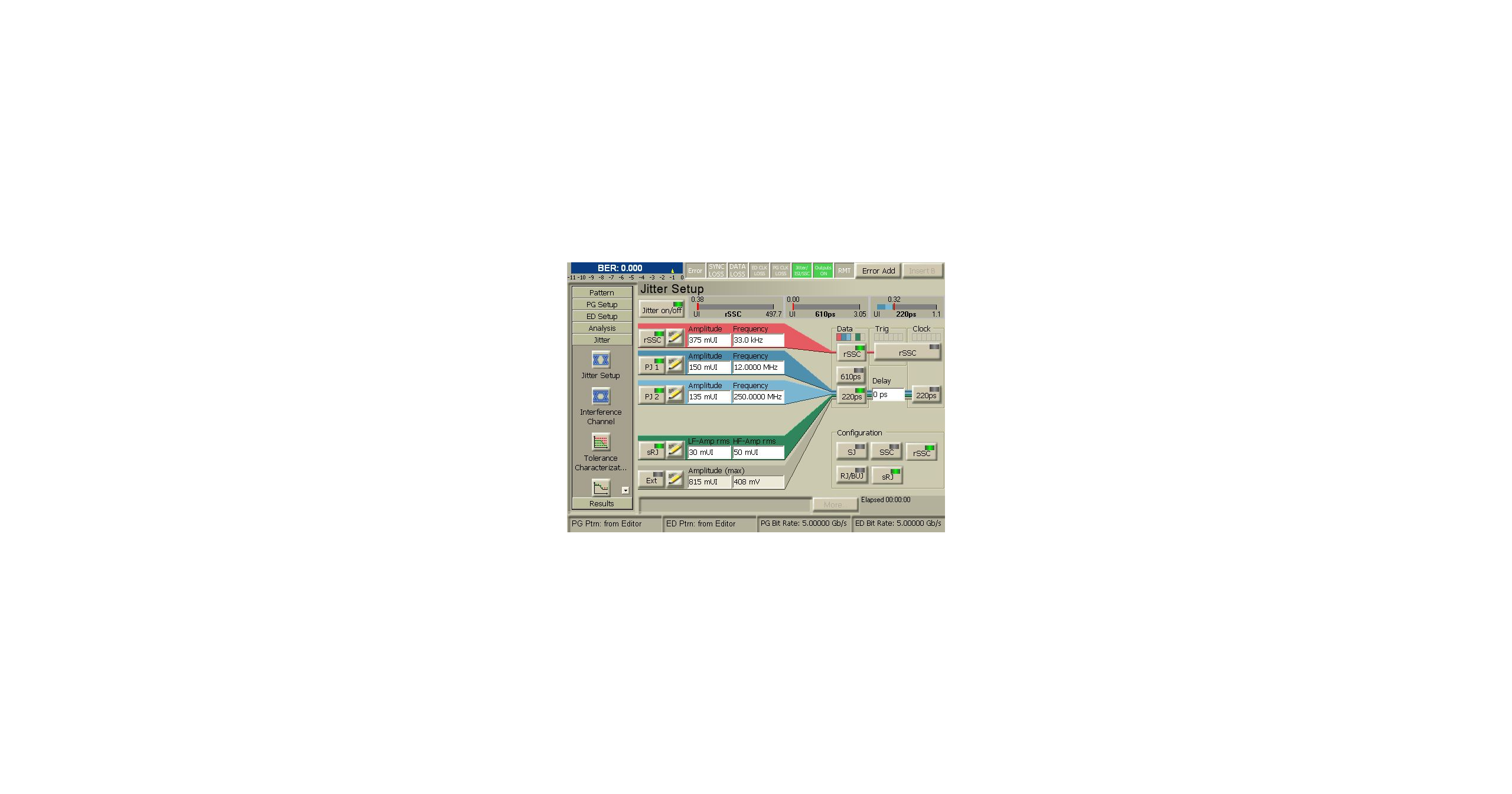 利用來(lái)自信號(hào)發(fā)生器的純凈信號(hào)可以實(shí)現(xiàn)精確的特性分析,該信號(hào)發(fā)生器具有極低的抖動(dòng)和極快的轉(zhuǎn)換時(shí)間。內(nèi)置的校準(zhǔn)抖動(dòng)源可以對(duì)接收機(jī)進(jìn)行精確的抖動(dòng)容限測(cè)試。