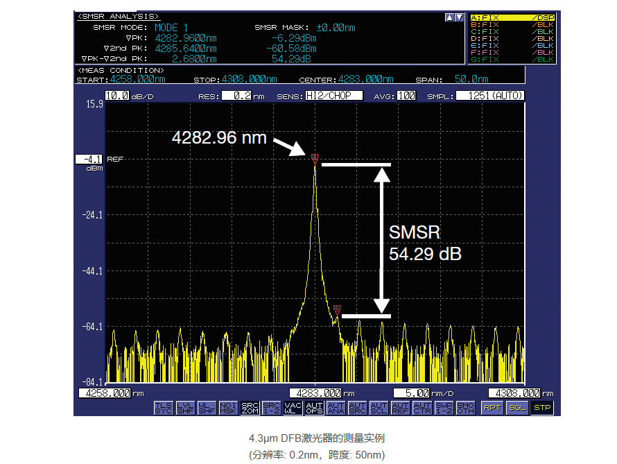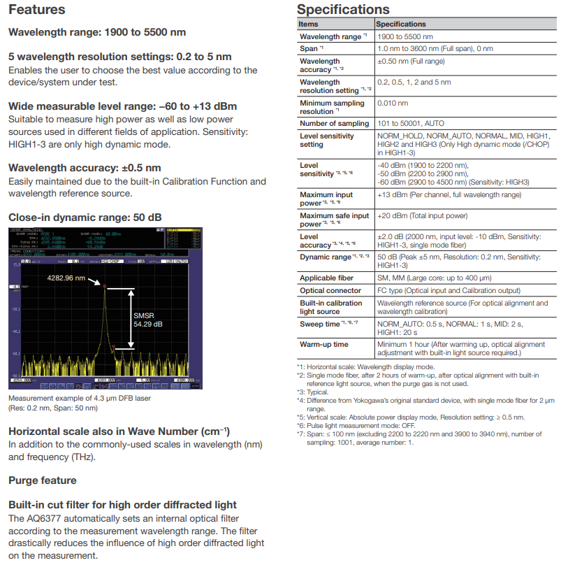 AQ6377具有73 dB的功率動(dòng)態(tài)范圍和50 dB的近距離動(dòng)態(tài)范圍,比在5μm波段工作的干涉儀型儀器的功率動(dòng)態(tài)范圍大2000倍,近距離動(dòng)態(tài)范圍大10倍。AQ6377能夠評估半導(dǎo)體激光器的邊模抑制比特性,市場上尚無其它如此高性能的同類設(shè)備 。